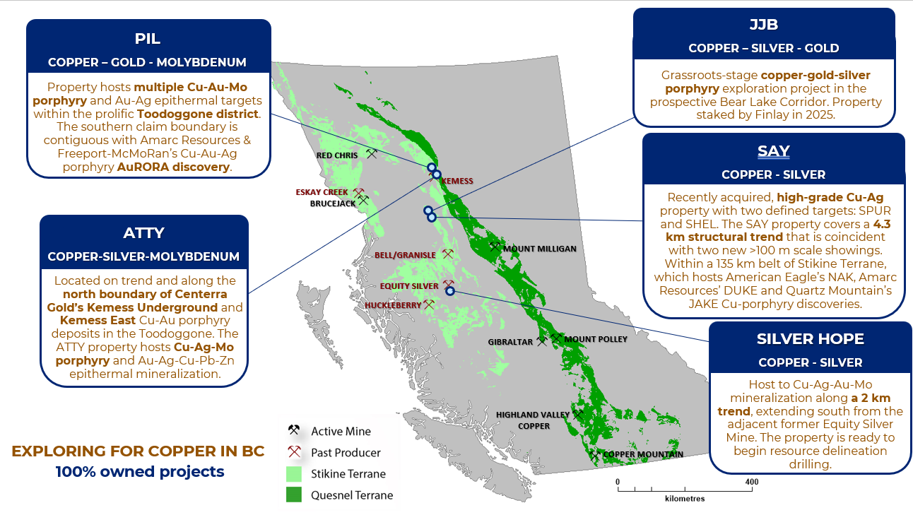 April 2025 marked the start of a 6 year earn-in term with Freeport-McMoRan on the PIL Property. Exploration expenditures of CAD $25 million will be solely funded by Freeport and cash payments totaling CAD $3 million will earn Freeport an 80% interest in the property. Finlay will be executing the work programs and will collect an Operator’s Fee.