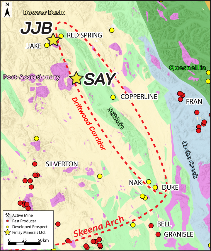 Finlay’s 100%-owned JJB Property covers 15,453 hectares (154 km2) of highly prospective Stikine Terrane, 150 km north of Smithers B.C, and 4 km north of the SAY Property claim boundary. The Stikine Terrane is a tectonic assemblage that hosts the metal endowment in B.C.’s Golden Triangle, the Toodoggone District, and the Skeena Arch. The JJB Property straddles the western margin of the relatively underexplored, 135-km-long, “Driftwood Corridor” of Stikinia, a tectonic position analogous to American Eagle Gold’s Nak Cu-Mo ± Ag ± Au porphyry prospect, 95 km to the south. The Driftwood Corridor hosts several volcanic redbed / sediment-hosted Cu ± Ag showings and prospects including the Copperline and Red Spring prospects. Porphyry prospects throughout the region are associated with post-accretionary Cretaceous – Eocene intrusions in both Stikinia (e.g. Imperial Metal’s Cu-Mo Porphyry Bear Lake Project) and overlying Bowser Basin sediments to the west (e.g. HDI Quartz Mountain’s Cu Porphyry Jake Project).