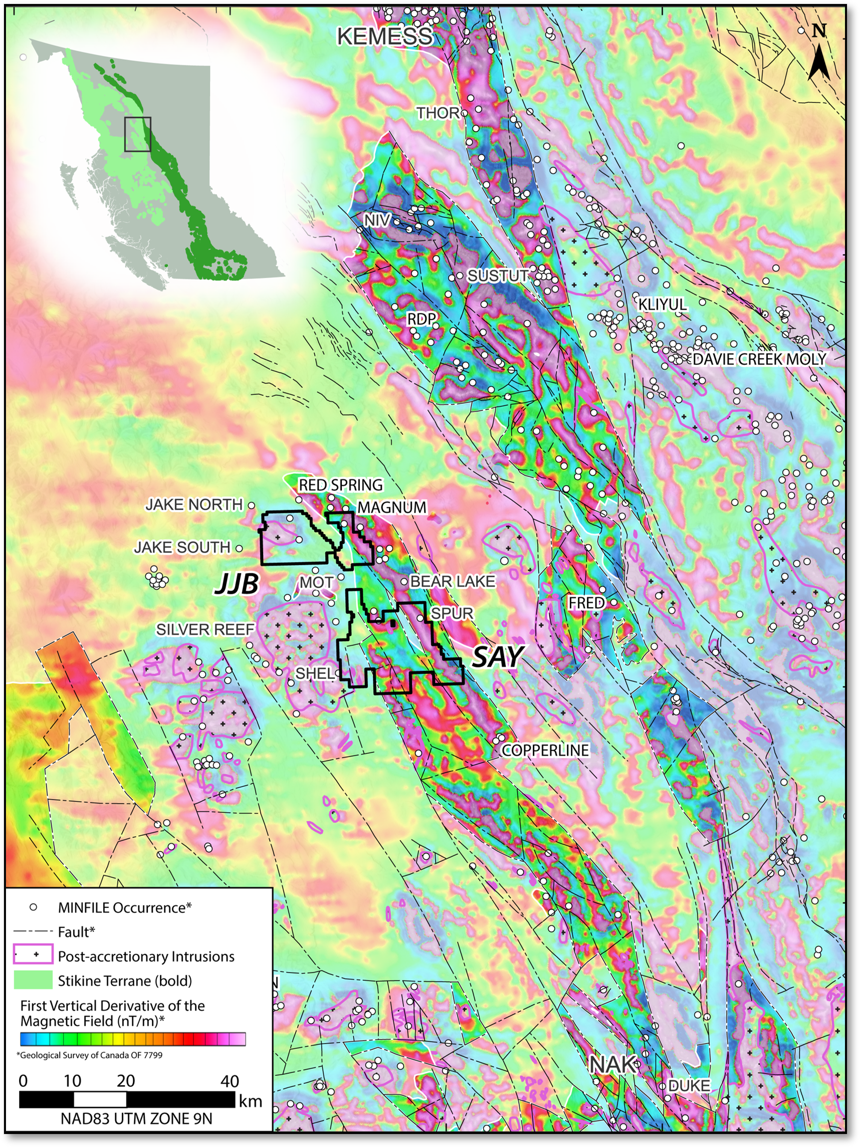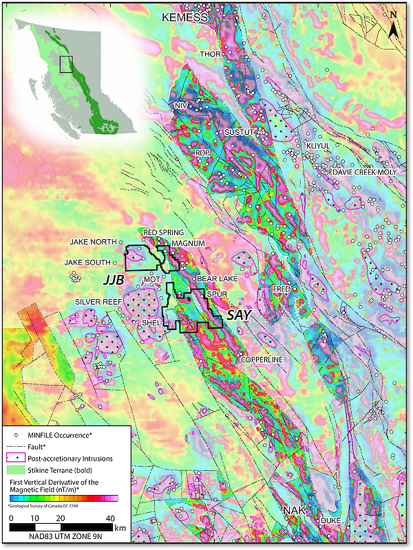 The JJB Property is located at the northern end of a 55-km-long, north-northwest-trending, strong magnetic high that hosts several showings and prospects. Projects in the broader region, including the Toodoggone, have demonstrated size potential: